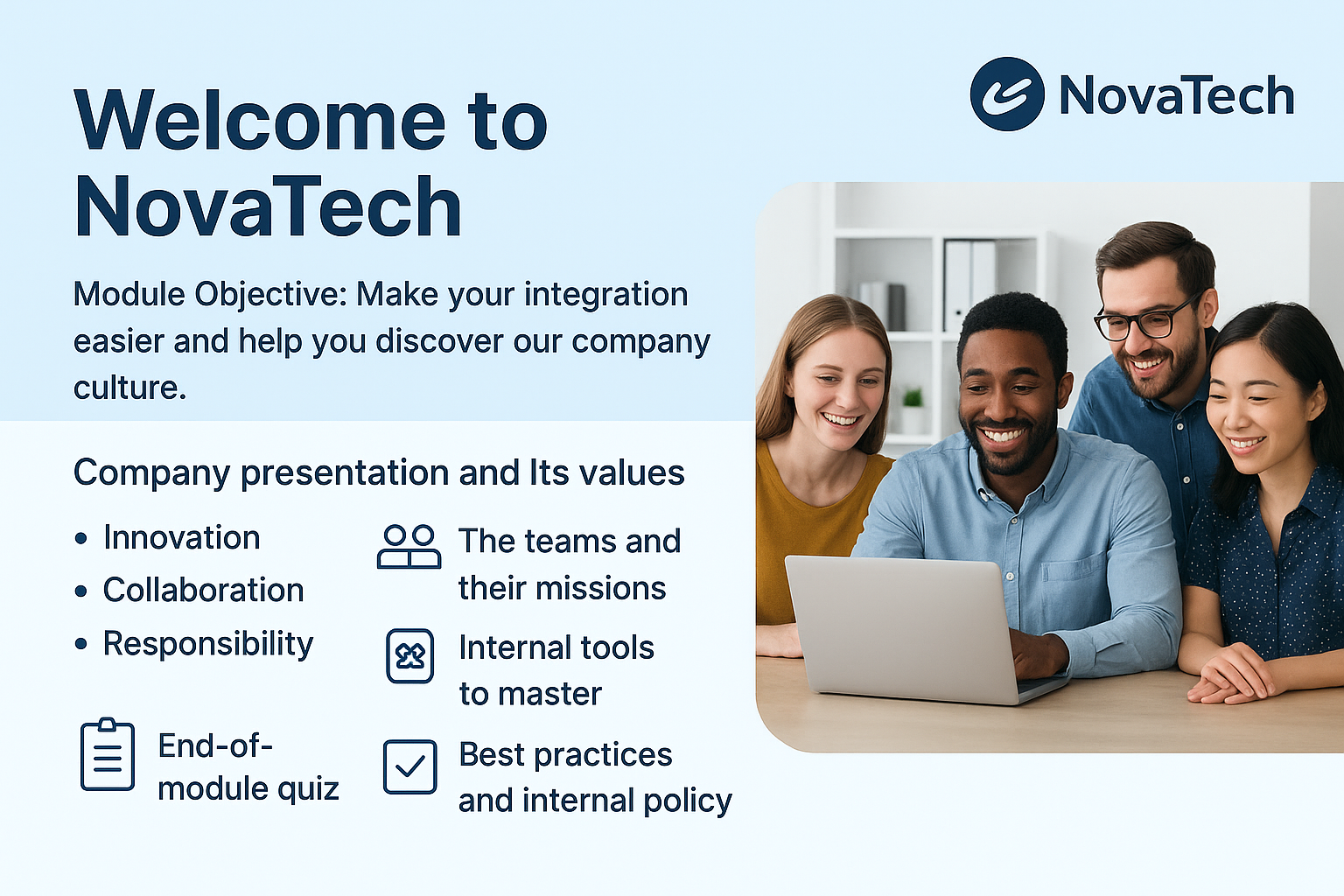 “Write an onboarding module for new employees, adapted to our corporate culture.”