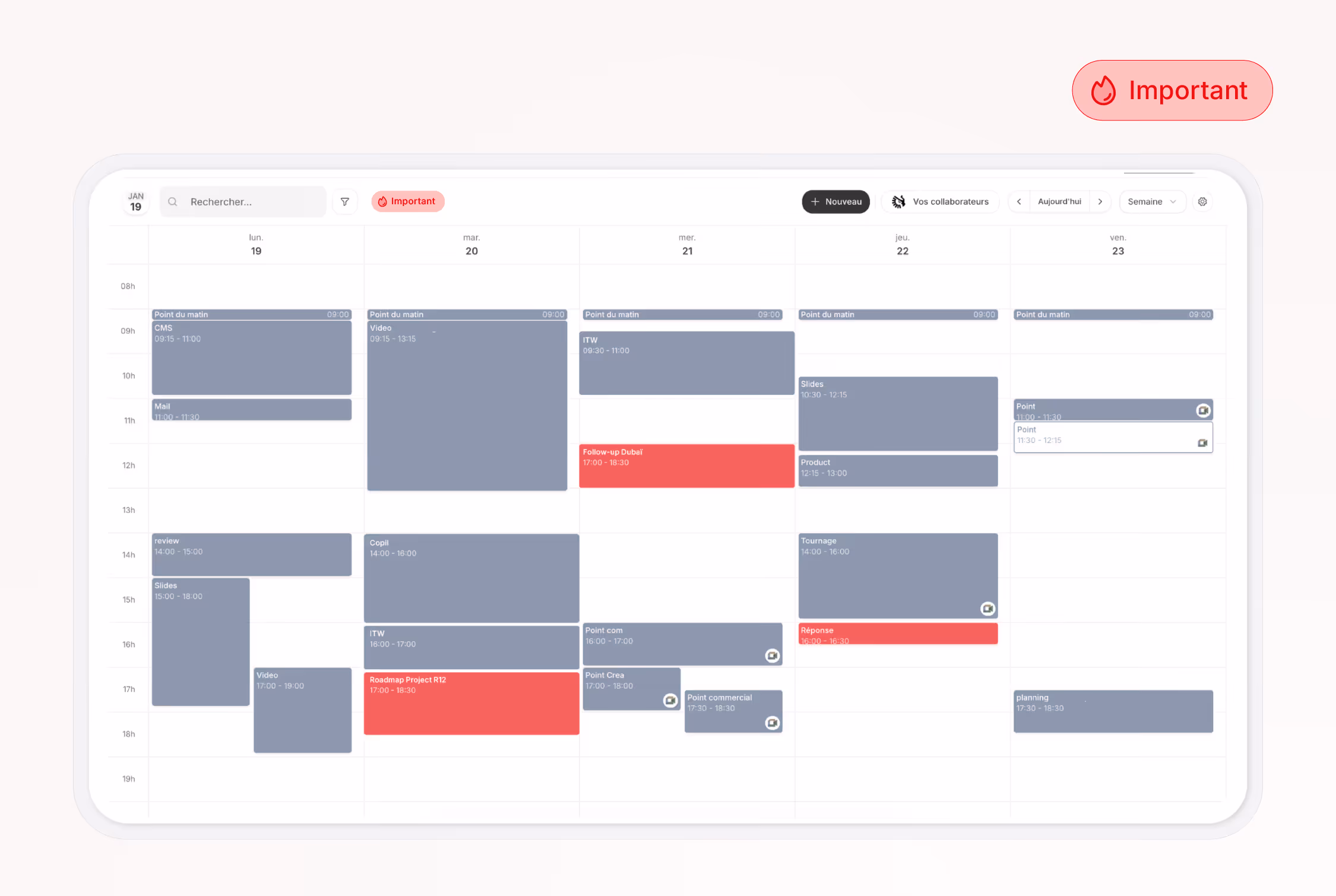 Calendar aide à prioriser les tâches selon leur importance et leur urgence (dates, collaborateurs, type de projet...), pour garantir que les projets clés restent sur la bonne voie et livrés à temps.