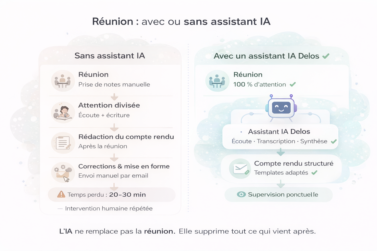 Avec l’assistant de réunion de Delos Recap, les équipes restent concentrées sur la discussion. Le bot rejoint automatiquement la réunion, en ligne ou en présentiel, capte les échanges, distingue les voix, puis génère le compte rendu. Rien à lancer, rien à rédiger.