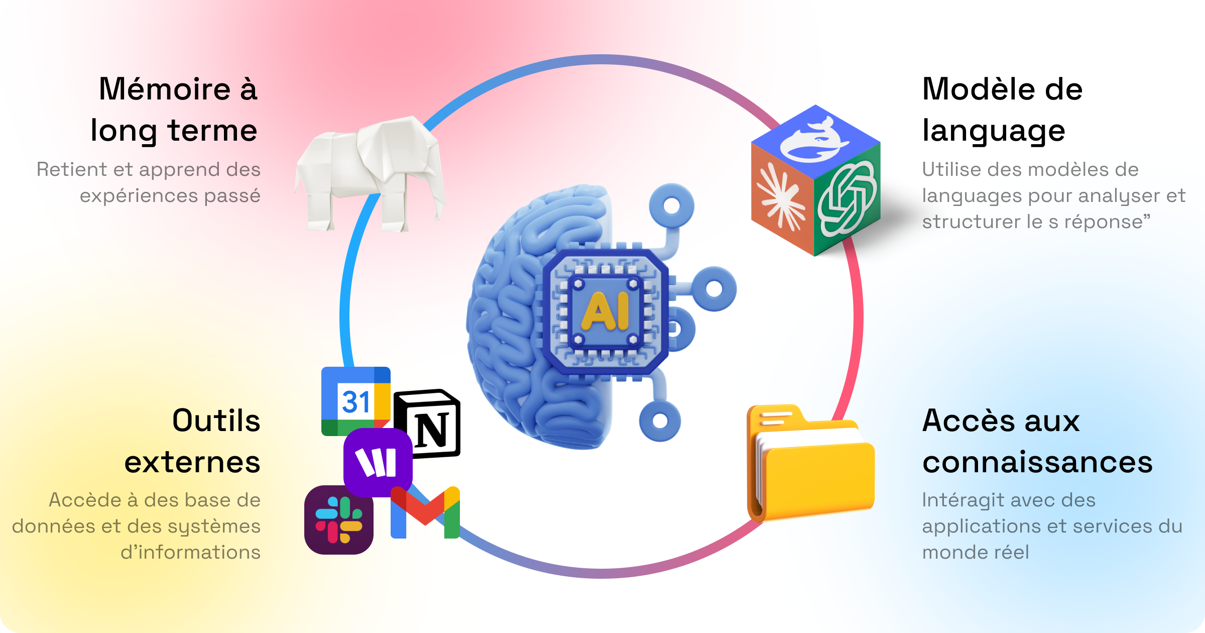 Un agent IA est un système capable non seulement de générer du texte comme un chatbot, mais surtout d’agir de façon autonome dans un cadre défini. On parle aussi d’agent intelligent, car il peut percevoir un contexte, raisonner, exécuter des actions et apprendre de ses interactions. La différence clé avec un simple chatbot : l’agent enchaîne des actions pour atteindre un résultat (un ticket clos, une opportunité créée, un contenu publié).