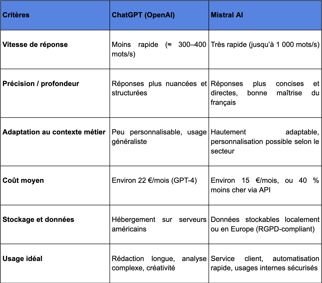 - Mistral se distingue sur les réponses rapides et confidentielles, particulièrement utiles dans les environnements professionnels sensibles.