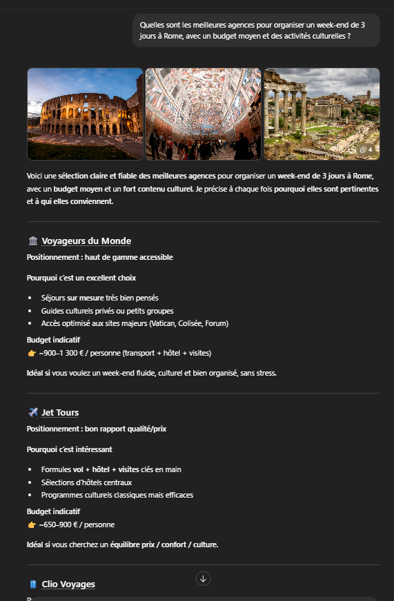 Ces marques n’ont pas été “choisies” par l’utilisateur via un clic. Elles ont été sélectionnées par l’IA parce que, dans son mécanisme de réponse, elles ressortent comme pertinentes au regard de la demande (destination, durée, budget, angle “culturel”).
