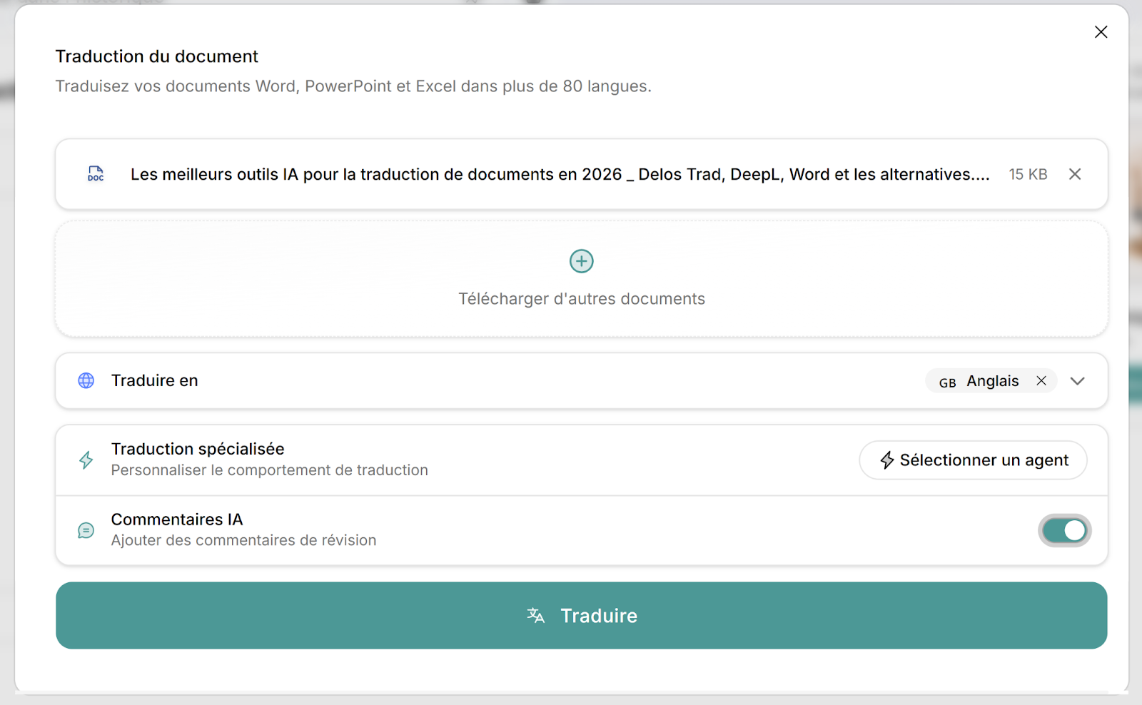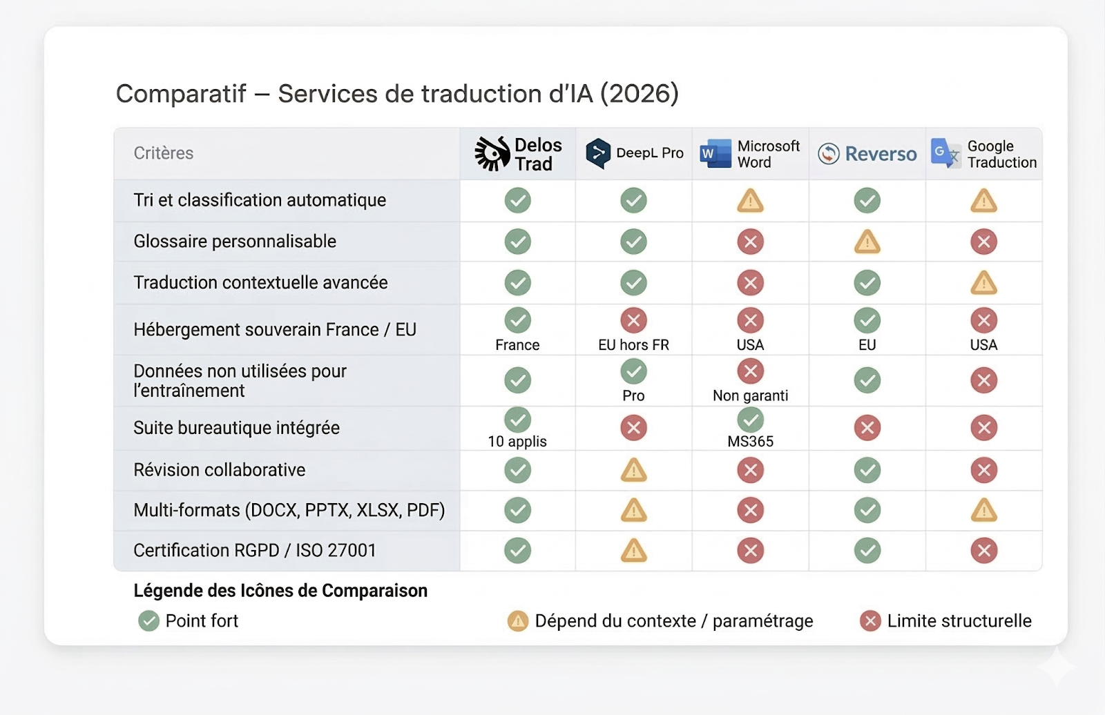 Cet article analyse les six meilleurs outils sur le marché en 2026 : Delos Trad, DeepL, Microsoft Word, Reverso Documents, Google Traduction et Doc Translator. Qualité, mise en forme, personnalisation, souveraineté des données, conformité RGPD : voici ce que chacun vaut réellement.