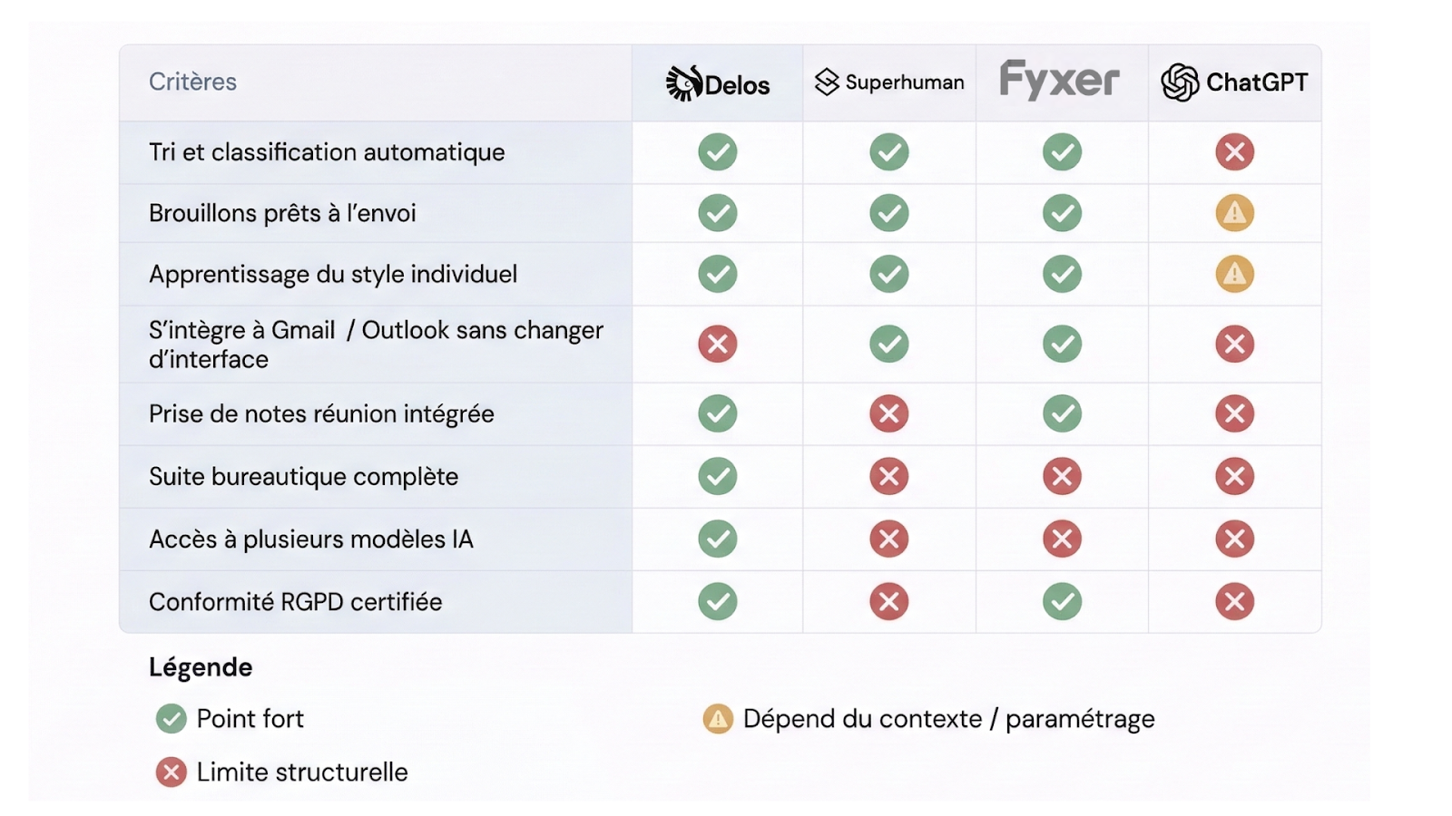 C'est précisément ce que change la logique d'orchestration : accéder aux modèles les plus performants du marché (GPT, Claude, Gemini, Mistral…) selon la tâche, dans un environnement unique, sans choisir une fois pour toutes entre eux. Sur la gestion des emails comme sur les autres usages bureautiques, Delos sélectionne automatiquement le modèle le plus adapté à ce qu'on lui demande.