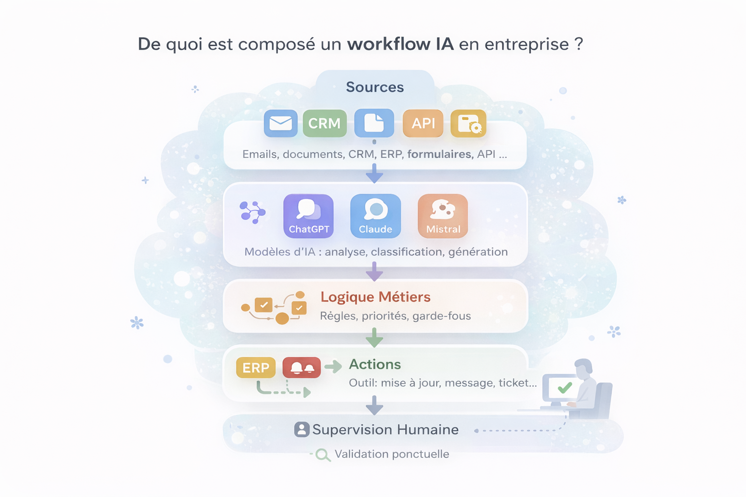 Un workflow IA en entreprise repose systématiquement sur cinq éléments :